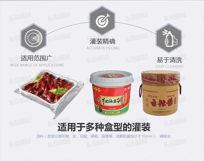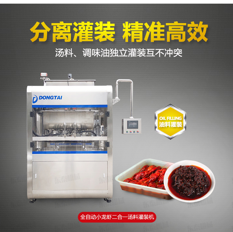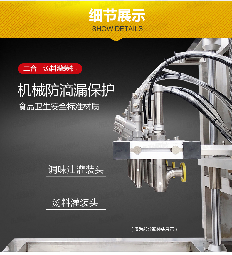 1.灌裝機在參考國外同類產(chǎn)品的基礎上進行改良設計,特制湯料、調(diào)味油灌裝頭,機械防滴漏保護,在灌裝過程中不會污染包裝容器。