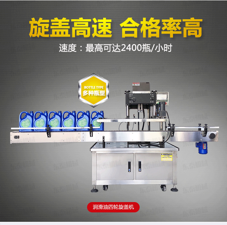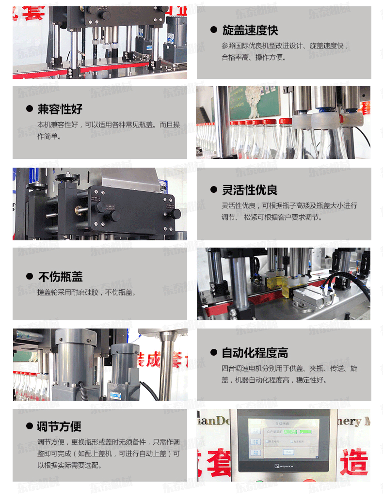 自動旋蓋機(jī)原理:電氣控制運動,穩(wěn)定性強(qiáng);設(shè)有定位裝置,旋蓋標(biāo)準(zhǔn),操作方便;鎖蓋范圍寬,可鎖不同形狀規(guī)格的瓶蓋;解決了噴頭、泵頭、噴霧泵、手扣式噴頭旋蓋難的問題;鎖蓋轉(zhuǎn)速可調(diào),可根據(jù)不同瓶蓋調(diào)節(jié)松緊度。