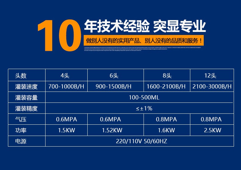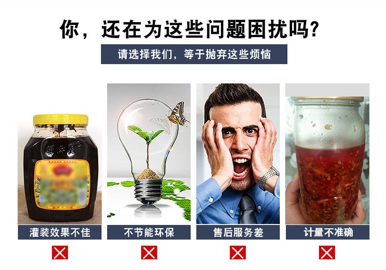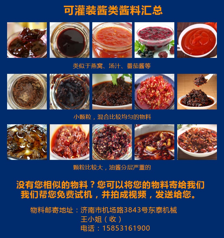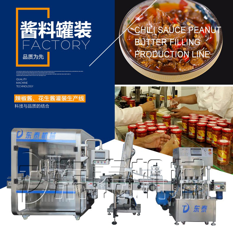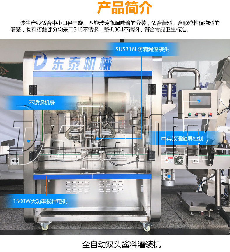 該生產(chǎn)線適合中小口徑三旋、四旋玻璃瓶調(diào)味醬的分裝,適合醬料、含顆粒黏稠物料的灌裝,物料接觸部分均采用316不銹鋼,整機304不銹鋼,符合食品衛(wèi)生標準。該機設(shè)計合理,機型小巧,立式結(jié)構(gòu),節(jié)省場地,操作方便。啟動部分均采用德國FESTO和臺灣AirTack的氣動元件。灌裝閥有氣動閥控制,灌裝精度更高,灌裝量和灌裝速度均可任意調(diào)整,灌裝悶頭采用防拉絲及升降灌裝裝置。