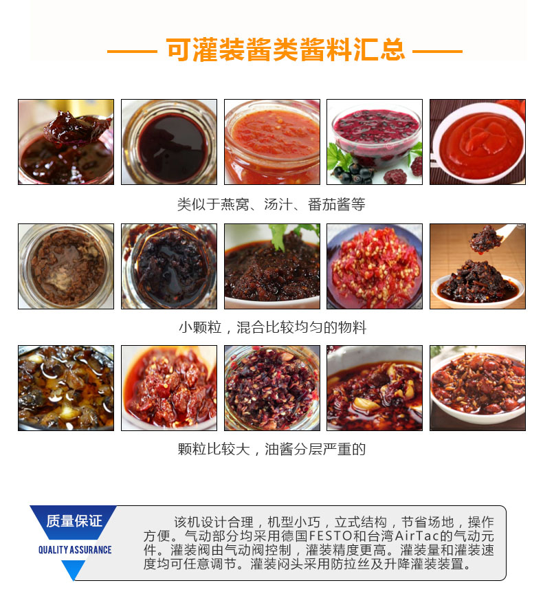 隨著機(jī)械技術(shù)的快速發(fā)展灌裝機(jī)的發(fā)展也是日新月異,使得其種類比較多。蘸醬在我國擁有悠久的歷史,在我國烹飪中占有著重要的地位,發(fā)展到現(xiàn)在在做菜和食品中也不可或缺,巨大的市場使得蘸醬灌裝機(jī)擁有巨大的市場,醬類廠家在引進(jìn)設(shè)備時都想采購到高效率、適合自己的蘸醬灌裝機(jī)械。人們對食品要求的提高使得醬類生產(chǎn)廠家迎來了較大的變格,安全衛(wèi)生是非常重要的標(biāo)準(zhǔn),因此對蘸醬灌裝機(jī)的選擇也更加的要求嚴(yán)格,許多傳統(tǒng)的機(jī)械已經(jīng)不能滿足企業(yè)高標(biāo)準(zhǔn)、高效率的要求。因此選擇一款適合的蘸醬灌裝機(jī)械產(chǎn)品顯得尤為重要。