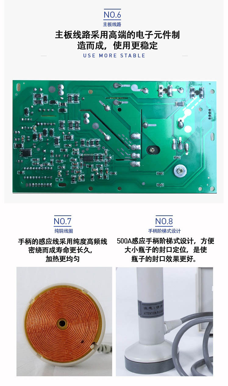 該封口機(jī)是一種便攜式電磁感應(yīng)加熱封口設(shè)備,專為制藥、化工、農(nóng)藥、食品、化妝品、輕工行業(yè)對容器進(jìn)行鋁箔嚴(yán)密封口。封口材質(zhì)使用廣泛,可以是聚乙烯、聚丙烯、聚苯乙烯、聚酯以及玻璃瓶,但不能用于金屬瓶體及瓶蓋。本機(jī)小巧輕便,使用簡單,適用于小批量生產(chǎn)和實驗室作業(yè)。本機(jī)采用國外先進(jìn)線路,選用日本最新模塊化功率器件,較于一般電子感應(yīng)加熱器更省電,熱效率達(dá)到90%以上,瞬時加熱速度為后者的20-30倍,因此不僅適用于熱封性能較好的聚乙烯、聚丙烯材質(zhì)的瓶體,而且對熱封性能較差的聚酯瓶、玻璃瓶也有極好的封口效果。