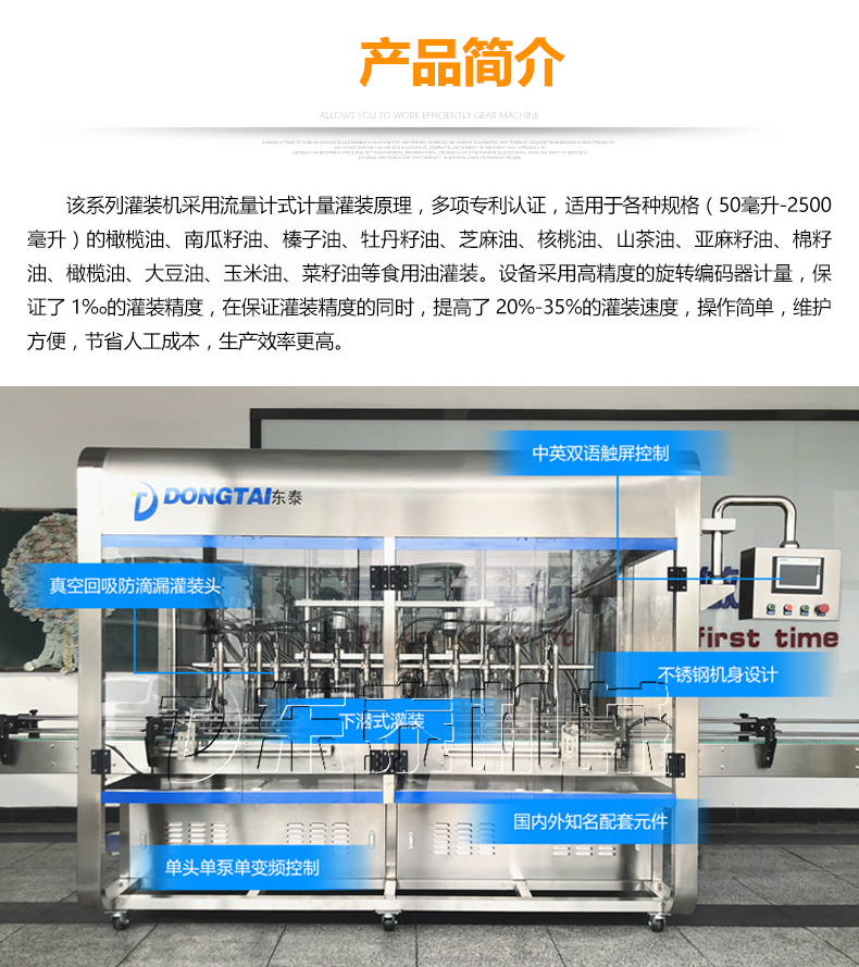 東泰機械至今有著二十年的研發(fā)生產經驗,擁有著精良的技術團隊,東泰研發(fā)的橄欖油自動灌裝機,橄欖油灌裝流水線都是機電一體的新型設備,橄欖油自動灌裝機計量采用高精度流量計與微電子數控儀表相結合的方式,灌裝精度相當高,還可以方便的進行無級調解灌裝容量,非常直觀,操作非常簡單。選擇包裝設備就要選經驗豐富、技術超前,設備完善的的大企業(yè),東泰機械通過二十多年的努力和發(fā)展,現已成為集科研、設計制造、成套供應、技術咨詢服務、工程總承包為一體的高科技型企業(yè)。東泰期待與您的合作,我們互利共贏!