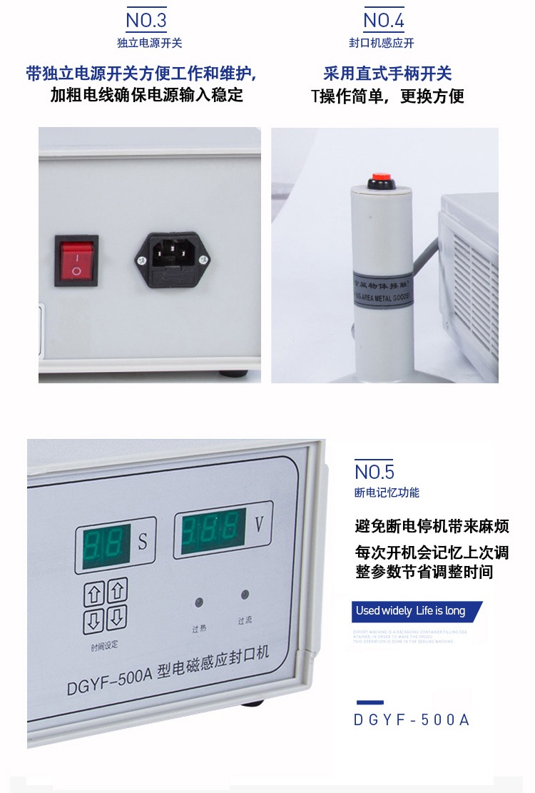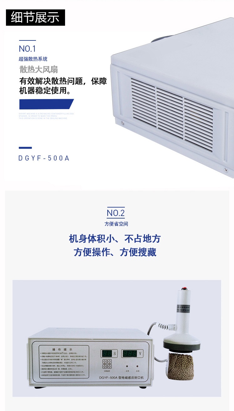 該封口機(jī)是一種便攜式電磁感應(yīng)加熱封口設(shè)備,專為制藥、化工、農(nóng)藥、食品、化妝品、輕工行業(yè)對容器進(jìn)行鋁箔嚴(yán)密封口。封口材質(zhì)使用廣泛,可以是聚乙烯、聚丙烯、聚苯乙烯、聚酯以及玻璃瓶,但不能用于金屬瓶體及瓶蓋。本機(jī)小巧輕便,使用簡單,適用于小批量生產(chǎn)和實驗室作業(yè)。本機(jī)采用國外先進(jìn)線路,選用日本最新模塊化功率器件,較于一般電子感應(yīng)加熱器更省電,熱效率達(dá)到90%以上,瞬時加熱速度為后者的20-30倍,因此不僅適用于熱封性能較好的聚乙烯、聚丙烯材質(zhì)的瓶體,而且對熱封性能較差的聚酯瓶、玻璃瓶也有極好的封口效果。