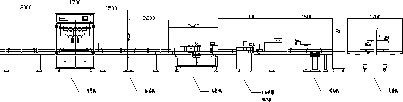 方案設(shè)計(jì)一:灌裝機(jī)+壓蓋機(jī)+貼標(biāo)機(jī)+自動(dòng)膠帽熱縮機(jī)+噴碼機(jī)+封箱機(jī) |